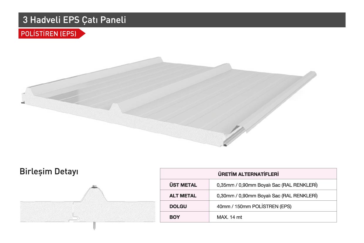 E tipi (DIN standardına göre B1) Alev Yürütmez ve ayrılmaz özelliği ile dünyanın en iyi ısı yalıtım malzemelerinden birisi olarak bilinen EPS (Genleştirilmiş Polistren) dolgu ile metalin yapıştırılması yoluyla üretilmektedir. her renkte boyalı sac ve alüminyumdan, istenilen boy ve kalınlıkta üretilebilmektedir.