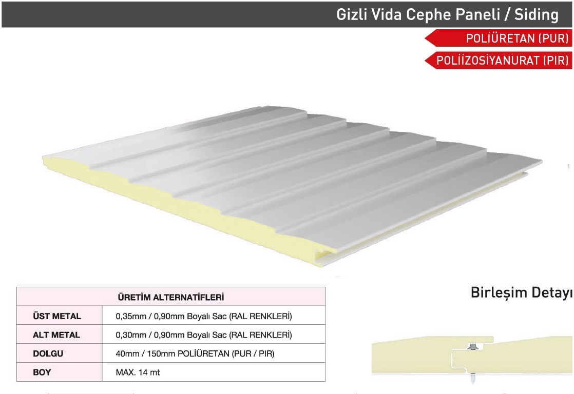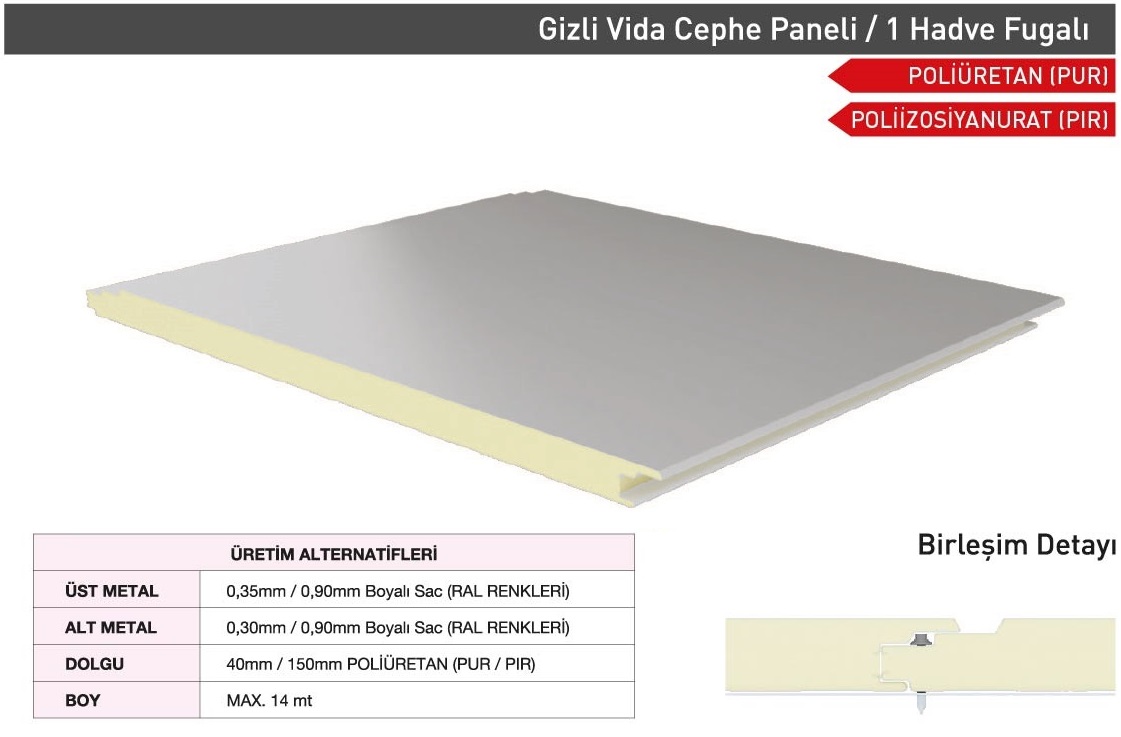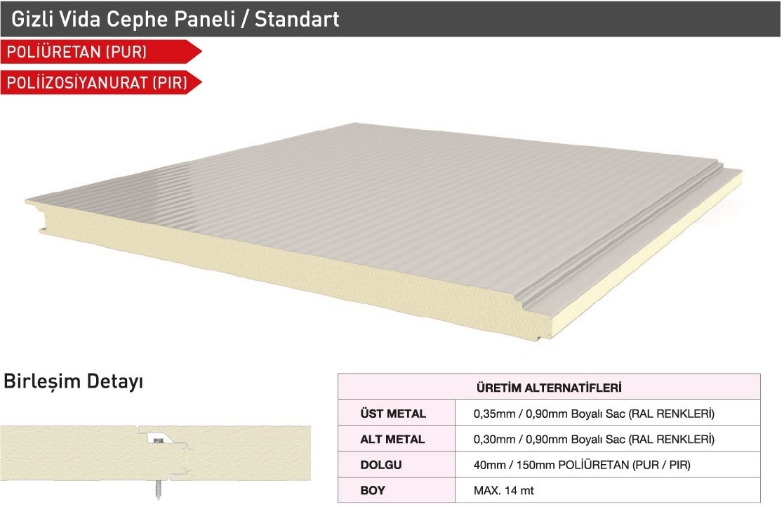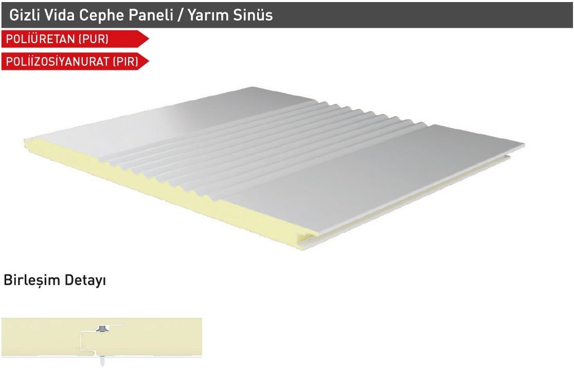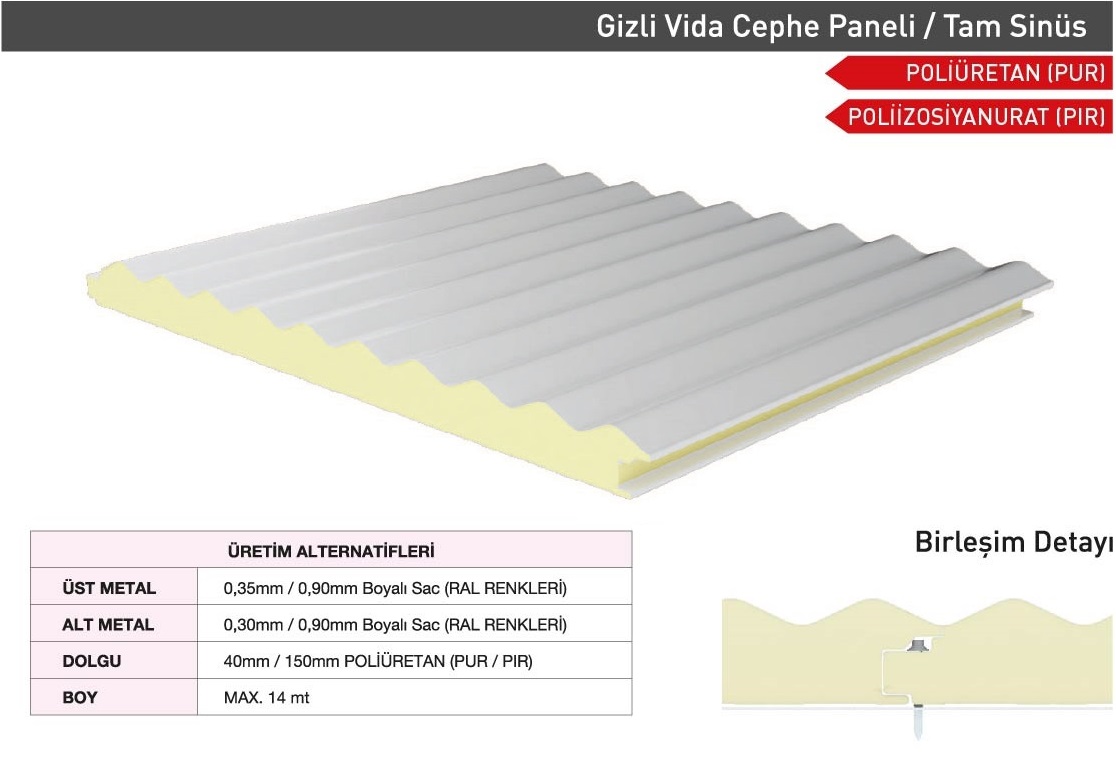 Sandwich cephe panelleri; Gizli vidalı olarak Farklı Estetik Görünümlerde (Sinüs form, Yarı sinüs form, Siding form, G Form, Standart Form Vb.) üretilebilmektedir. Müşteri talepleri doğrultusunda Dışarıdan vidalı formlarda üretilmekte olup her türlü ihtiyacı karşılayacak şekilde tasarlanmıştır. TSE EN ve ISO normlarına uygun olarak kaliteli üretim ve ham madde girişinden teslimata kadar her adımda kalite kontrolünü titizlikle sürdürmektedir.