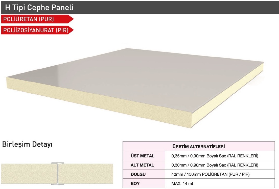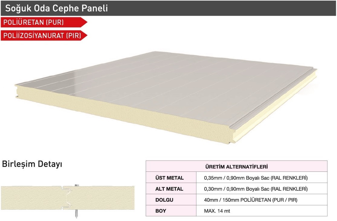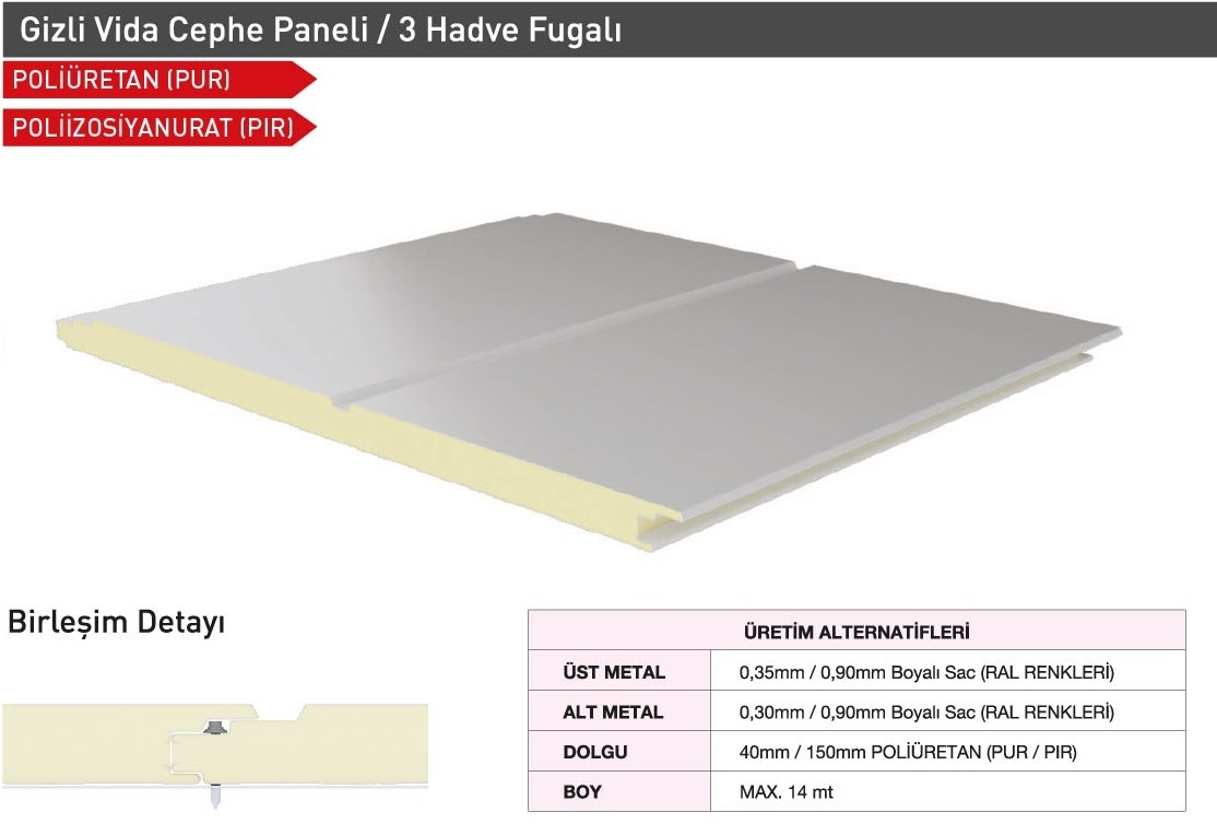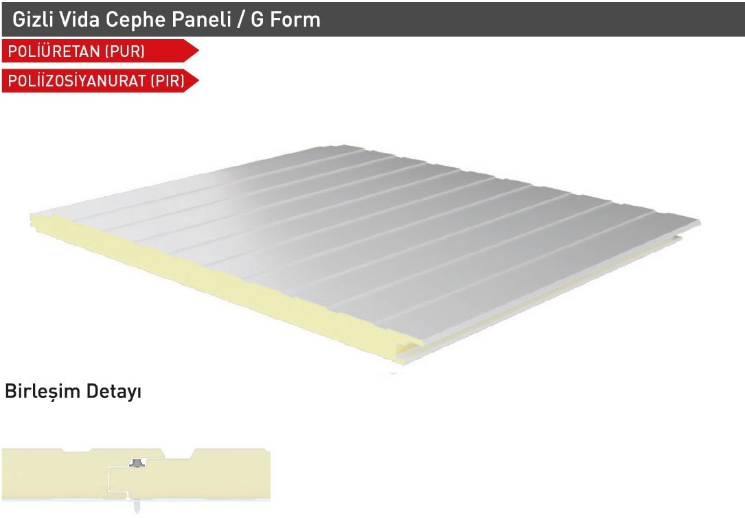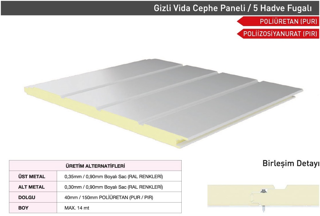 Sandwich cephe panelleri; Gizli vidalı olarak Farklı Estetik Görünümlerde (Sinüs form, Yarı sinüs form, Siding form, G Form, Standart Form Vb.) üretilebilmektedir. Müşteri talepleri doğrultusunda Dışarıdan vidalı formlarda üretilmekte olup her türlü ihtiyacı karşılayacak şekilde tasarlanmıştır. TSE EN ve ISO normlarına uygun olarak kaliteli üretim ve ham madde girişinden teslimata kadar her adımda kalite kontrolünü titizlikle sürdürmektedir.