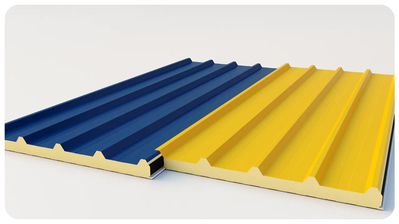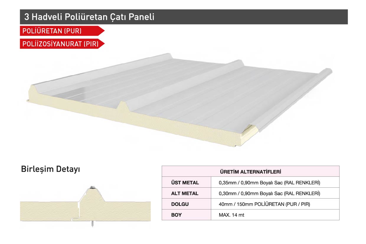Panellerin alt ve üst yüzeylerinde kullanılan alimünyum ve galvanizli saç Coil Coating teknolojisi ile boyanmaktadır. Uygulanan boya teknolojisi, panellerin dış ortam koşullarına uzun yıllar boyunca dayanıklı ve zengin renk seçeneklerine sahip olması sağlamaktadır. Panel üretiminde değişik kalınlıkta yüksek kaliteli aliminyum ve sac kullanımı ile farklı taşıyıcı sistemlere uygun malzeme seçenekleri sunulmaktadır. Montaş kolylığı ve aksesuar seçenekleri ile poliüretanlı paneller, yapılarda alternatif çözümler sunan güvenilir çatı ve cephe kaplama ürünleridir. Poliüretanlı paneller, geniş aşık aralıkları ve ağır çatı yüklerine(yağmur, kar , rüzgar) karşı dirençli, çatı kaplarına en uygun çözümü sağlayan kesitte dizayn edilmiştir. Poliüretanlı paneli enine ek binişli istem olarak tasarlanmış olup, kep kullanmayı gerektirmeden su izolasyonunu mükemmel sağlar.