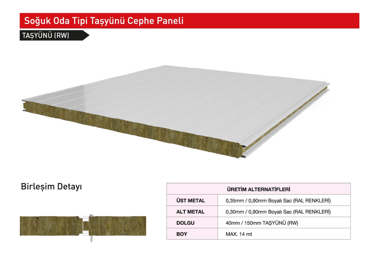 Taşyünü ve Eps izolasyon alternatifli çatı panelleri maksimum seviyede ısı, ses ve su yalıtımı sağlamaktadır. Cephe de alternatif renk seçenekleri ile estetik bir görünüm elde edilir. Sıva ve boyaya gerek kalmaz. Fabrika ve depo binaları, spor salonları, hayvan yetiştirme çiftlikleri, alışveriş merkezleri, sanayi yapıları, şantiye binaları ve konteynırlarda rahatlıkla kullanılabilir.